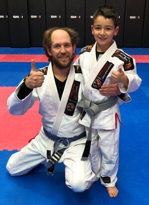 Justin’s white belt with blue stripe Jiu-Jitsu grading.
